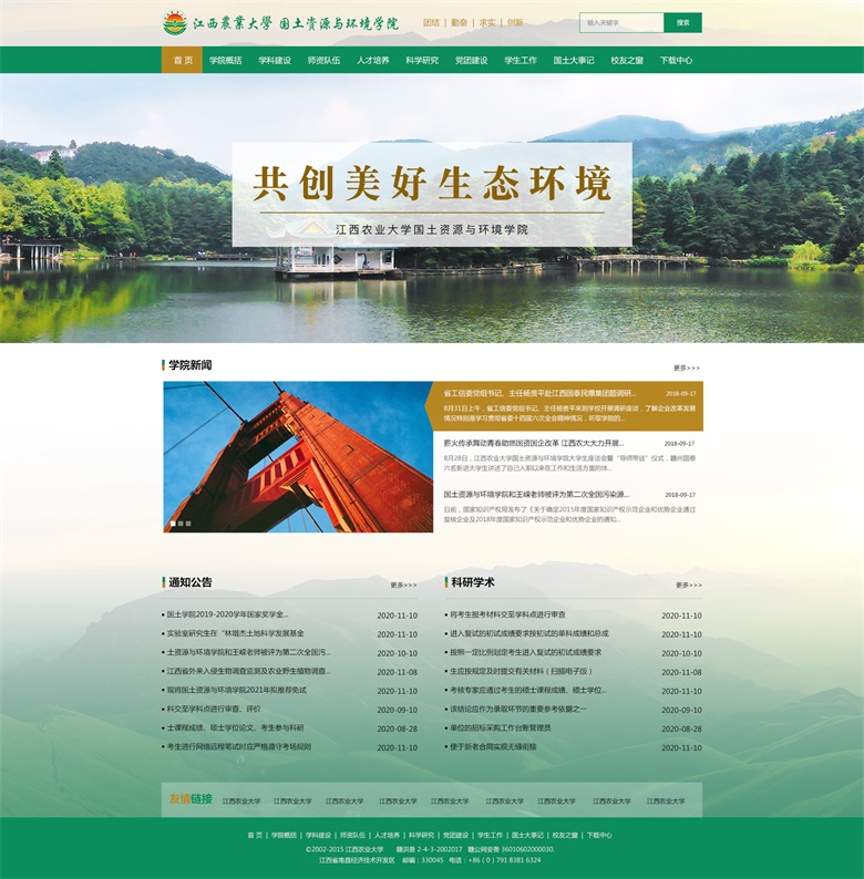 江西農(nóng)業(yè)大學(xué)國土資源與環(huán)境學(xué)院辦學(xué)歷史悠久,最早可追溯到1940年中正大學(xué)的土壤學(xué)和農(nóng)業(yè)化學(xué)學(xué)科,1997年由原資源與環(huán)境系、環(huán)保系和土管系合并而成。學(xué)院下設(shè)黨委行政辦公室、學(xué)生工作辦公室、教學(xué)管理辦公室和資料室等4個(gè)服務(wù)部門,農(nóng)業(yè)資源與環(huán)境系、環(huán)境科學(xué)與工程系、農(nóng)業(yè)水利工程系、土地資源管理系和旅游管理系等5個(gè)教學(xué)單位,以及江西省鄱陽湖流域農(nóng)業(yè)資源與生態(tài)重點(diǎn)實(shí)驗(yàn)室、南昌市景觀與環(huán)境重點(diǎn)實(shí)驗(yàn)室、江西農(nóng)業(yè)大學(xué)農(nóng)業(yè)資源與環(huán)境實(shí)驗(yàn)教學(xué)示范中心、土地資源管理實(shí)驗(yàn)室、資源環(huán)境遙感與信息實(shí)驗(yàn)室和江西農(nóng)業(yè)大學(xué)土地科學(xué)研究所等6個(gè)教學(xué)與科研平臺。 學(xué)院擁有一支初具規(guī)模、結(jié)構(gòu)合理且?guī)煹聡?yán)謹(jǐn)、學(xué)術(shù)優(yōu)良的師資隊(duì)伍。截止2017年8月,學(xué)院現(xiàn)有教職工83人,專任教師61人,其中教授15人,副教授22人,博士生導(dǎo)師6人,博士43人。全國模范教師1 人、享受國務(wù)院政府特殊津貼者2人、“贛鄱英才555 工程”領(lǐng)軍人才2人、江西省優(yōu)秀教師1 人、江西省高等學(xué)校中青年學(xué)科帶頭人6人,江西省新世紀(jì)百千萬人才工程第一、二層次人選5名。同時(shí),對外聘請客座和兼職教授8人。 學(xué)院在強(qiáng)化基礎(chǔ)研究和應(yīng)用基礎(chǔ)研究的基礎(chǔ)上,不斷拓展應(yīng)用研究和社會服務(wù)工作。近年來,承擔(dān)國家自然科學(xué)基金項(xiàng)目、國家社會科學(xué)基金項(xiàng)目、國家“973”子項(xiàng)目、“十三五”國家重點(diǎn)研發(fā)計(jì)劃項(xiàng)目、省部級及市(廳)級各類課題318項(xiàng),發(fā)表論文346篇,出版著作16部,獲國家級、省部級等科技獎(jiǎng)勵(lì)23項(xiàng),獲專利8項(xiàng),其中一大批科技成果在社會上得以廣泛應(yīng)用,取得良好的經(jīng)濟(jì)效益、社會效益和生態(tài)效益。 雅騰科技根據(jù)學(xué)院的具體需求,進(jìn)行量身定制設(shè)計(jì)、采用寬屏布局、簡潔、大氣、上檔次。 (江西農(nóng)業(yè)大學(xué)國土資源與環(huán)境學(xué)院網(wǎng)站首頁設(shè)計(jì)效果圖) 雅騰科技專注企業(yè)網(wǎng)站建設(shè)、微信小程序、軟件系統(tǒng)、公眾號定制開發(fā),有專業(yè)的技術(shù)團(tuán)隊(duì),為企業(yè)提供高性價(jià)比的技術(shù)開發(fā)支持服務(wù)。