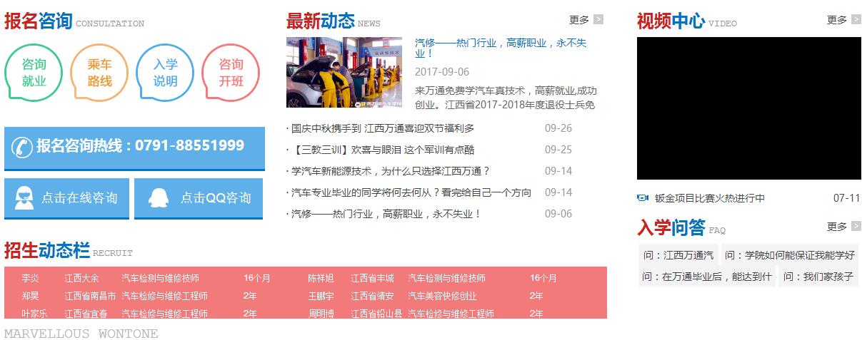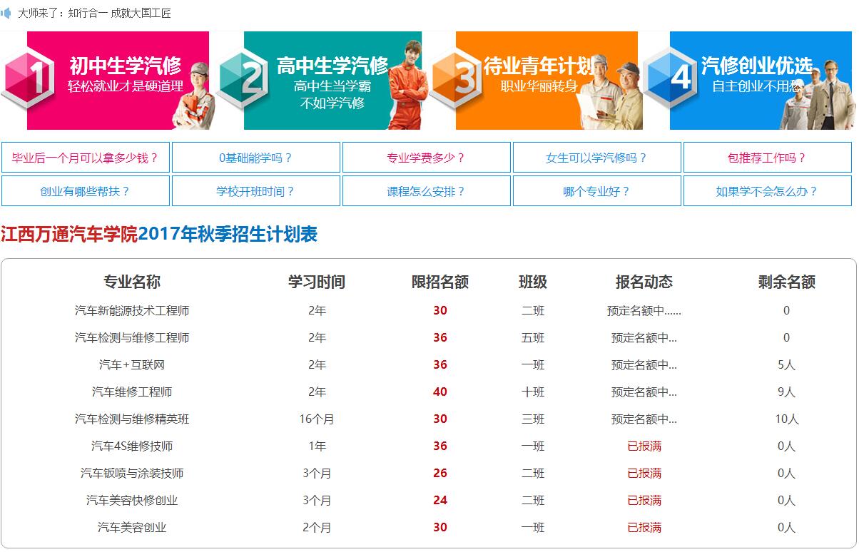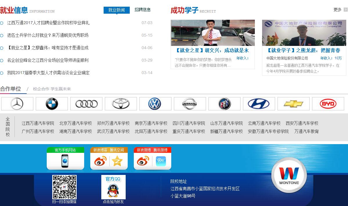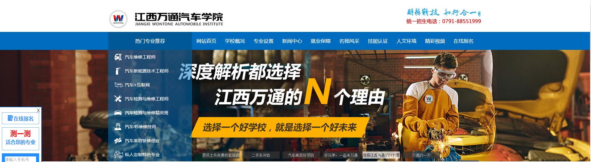 江西萬(wàn)通汽車學(xué)院是汽修技術(shù)人才培養(yǎng)基地、全國(guó)汽車行業(yè)示范職教單位、汽車行業(yè)協(xié)會(huì)理事會(huì)員單位、汽修教育院校。學(xué)校位于江西省南昌市。教學(xué)樓、實(shí)訓(xùn)樓、學(xué)生公寓、多功能體育活動(dòng)中心等基礎(chǔ)設(shè)施一應(yīng)俱全,并建有高等轎車檢測(cè)中心 、電控實(shí)訓(xùn)廳、整車實(shí)訓(xùn)廳、電器實(shí)訓(xùn)廳、四輪定位實(shí)訓(xùn)廳、汽車美容實(shí)訓(xùn)廳、多媒體網(wǎng)絡(luò)中心等現(xiàn)代實(shí)驗(yàn)、實(shí)訓(xùn)廳等50余間,為滿足學(xué)生實(shí)踐動(dòng)手操作的需要,學(xué)校擁有中、美、德、日、韓等五大車系100余部各品牌汽車供學(xué)子實(shí)戰(zhàn) 、實(shí)訓(xùn)。其中,校園汽車4S模擬教學(xué)基地和汽車美容創(chuàng)業(yè)項(xiàng)目示范中心領(lǐng)跑國(guó)內(nèi)職業(yè)教育。