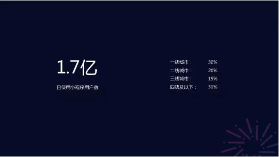小程序作為一種新的應用形態(tài),逐漸被廣大用戶所接受,目前日使用小程序用戶數(shù)達1.7億,有一半用戶分布于一線城市和二線城市,讓我們可喜的是,三線城市和四線及以下城市的使用也很廣泛。