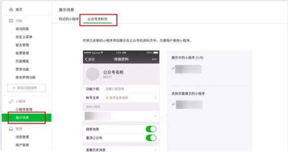點(diǎn)擊左側(cè)邊欄中的「展示場景」,并選擇頁面頂部的「公眾號(hào)資料頁」。