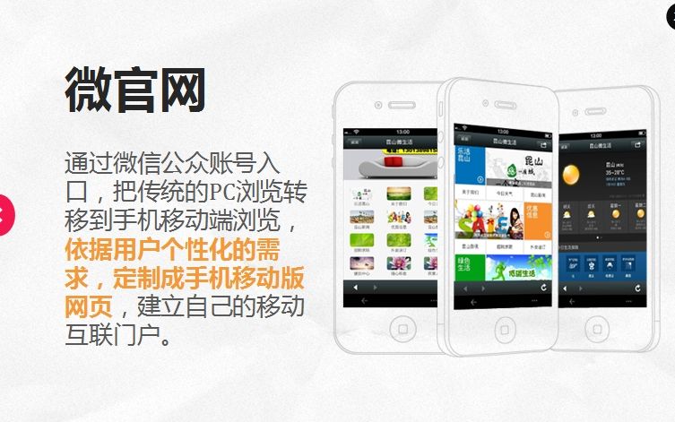 那么先來講一下這個(gè)微網(wǎng)站,其實(shí)微網(wǎng)站也就是微官網(wǎng),是在移動(dòng)互聯(lián)網(wǎng)發(fā)展環(huán)境下產(chǎn)生的一種新型的webAPP和傳統(tǒng)PC網(wǎng)站結(jié)合的網(wǎng)站。它可以兼容多種智能手機(jī)的操作系統(tǒng),可以和微博、微信之間相互鏈接,是一種適用于移動(dòng)端瀏覽和交互的新型網(wǎng)站類型。